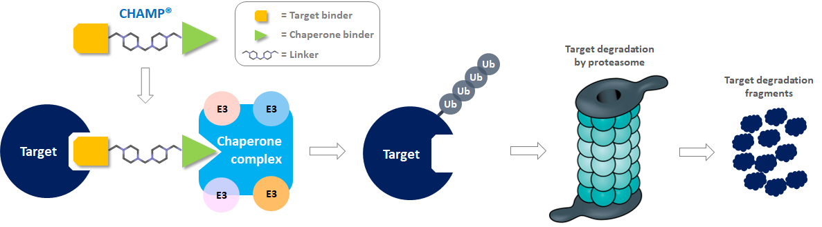 Ranok has developed an innovative, next-generation approach to TPD. Chaperone-mediated Protein Degradation/Degrader (CHAMP™) technology is based on our founder’s extensive backgrounds in protein homeostasis research. This technology takes advantage of different underlying biological processes from other TPD approaches, and has a number of unique advantages, including improved safety due to the selective targeting of tumors.